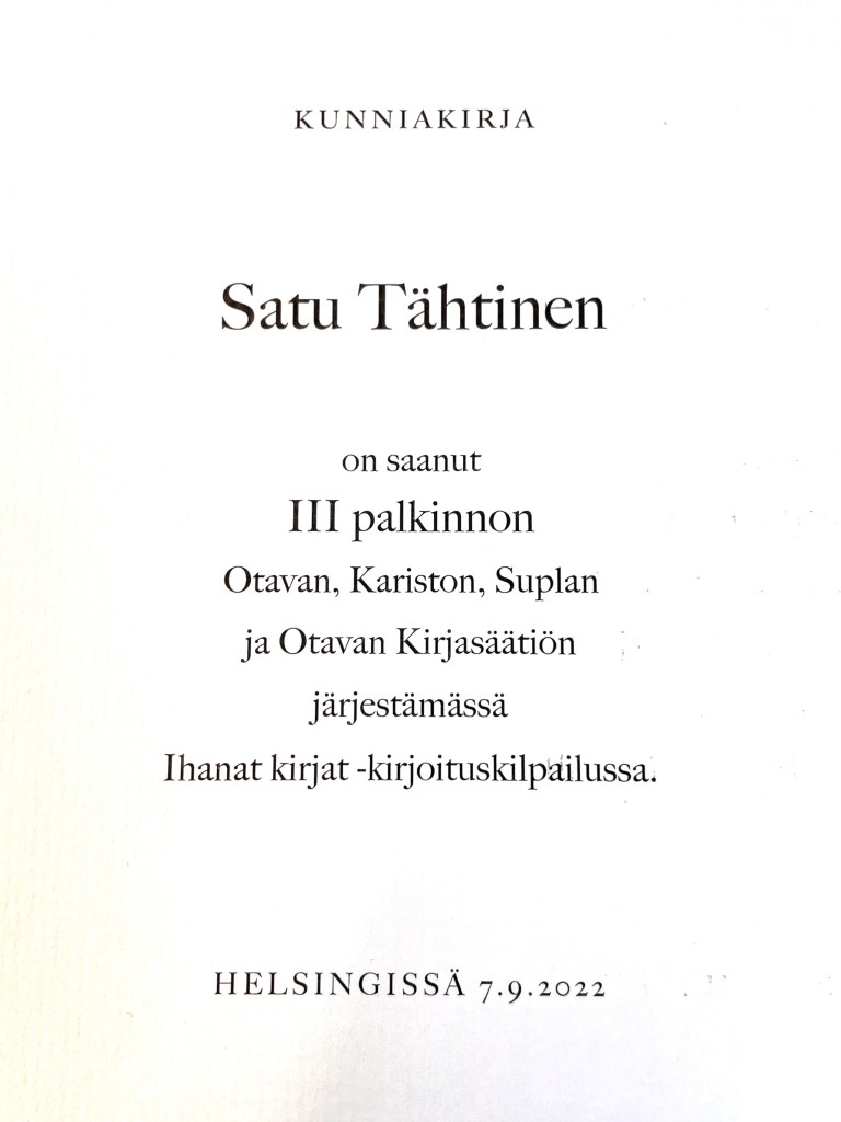 Esikoisteokseni Kalajoen hiekat sijoittui kolmannelle sijalle Suplan, Otavan, Kariston ja Otavan kirjasäätiön Ihanat kirjat -viihdekirjakisassa. Kolmossijasta pokkasin 1000 euron palkinnon, Suplan ja Ruutu+-palvelun vuodeksi sekä 100 euron lahjakortin Otavan kirjakauppaan.